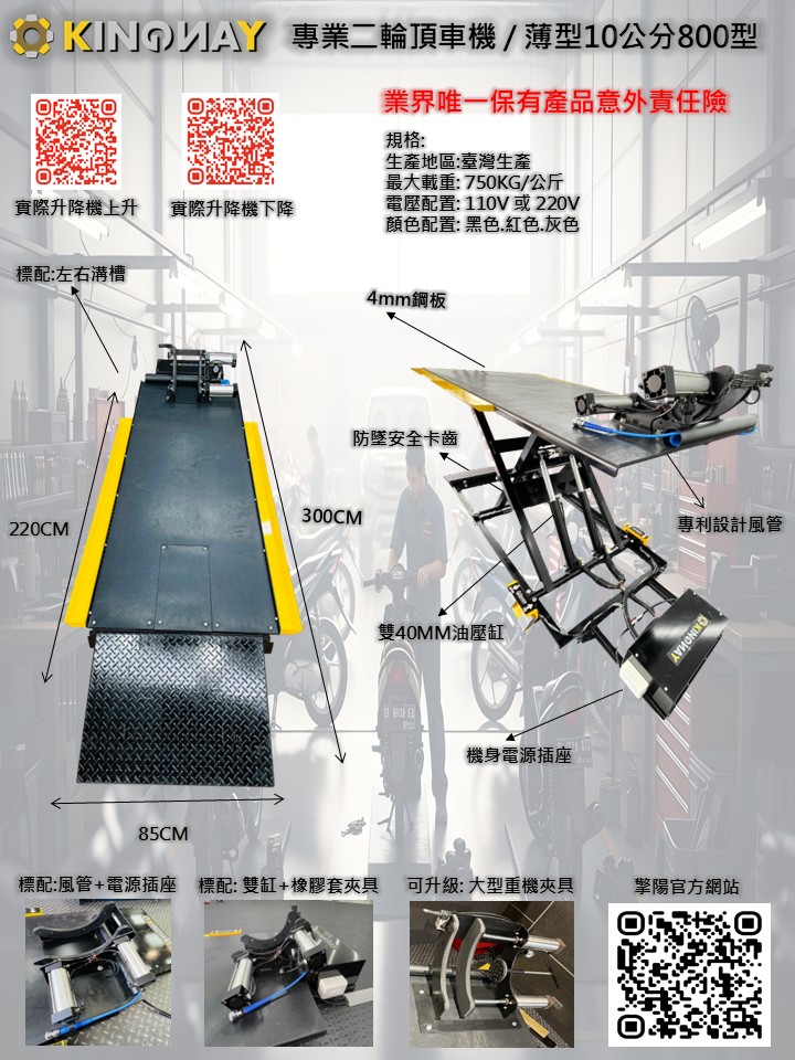薄型10公分/800型·頂高機*適合重機維修 *加大馬達顏色客製化電壓110V 或 220V 任選離地高度 10公分檯面尺寸220 * 85公分機身總長 300公分最大載重 750 KG·雙油壓缸———————————————標準配備:*獨家人性化配置1. 專利檯面收縮風管2.標準雙氣缸夾輪器*含橡膠套*3.基本檯面防滑墊4.馬達箱電源插座110V5.檯面尾端開尾門———————————————選購配備:1. 重機加大雙氣缸夾輪器*手動加氣動設計2. 檯面左右置物架*粉體烤漆 車輛實際乘載: