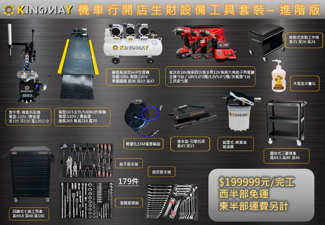 圓夢開店 #進階版套裝KINGYANG 雙手臂-拆胎機*1台KINGYANG 薄型10.5公分500型升降機*1台KINGYANG 靜音式6HP空壓機*1台美沃奇18V中扭力扳手機+六角起子機+震動電鑽組KINGYANG 15M風管輪座*1顆KINGYANG 基本款-引擎托架*1台KINGYANG 氣動式抽油器*1個KINGYANG 開放式三層推車*1台KINGYANG 移動式-工作椅*1張木易洗手膏*1罐KINGYANG 回歸式鋼珠七抽工具車 *1台KINGYANG179件手工具盤*1套第一盤起子鉗類扳手盤第二盤各式扳手綜合盤第三盤各式套筒扳桿盤