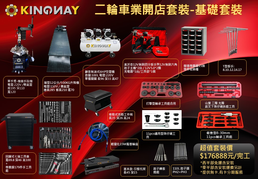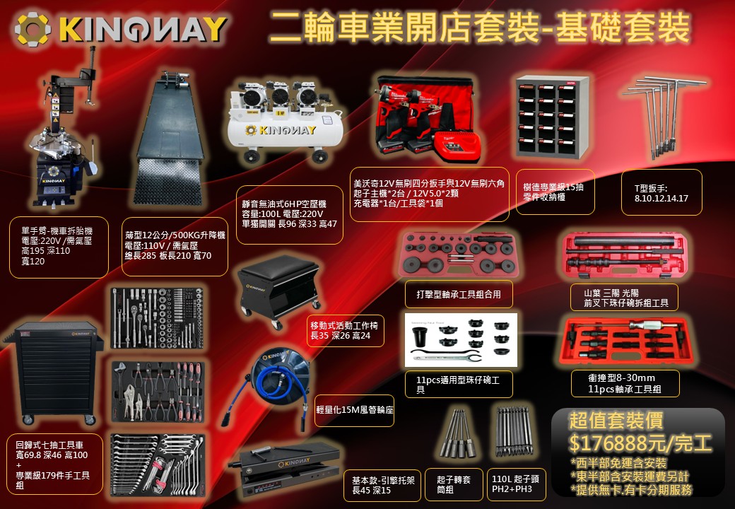 圓夢開店 #基礎套裝KINGYANG 單手臂-拆胎機*1台KINGYANG 薄型12公分500型升降機*1台KINGYANG 靜音式6HP空壓機*1台美沃奇18V中扭力扳手機+六角起子機組樹德專業15抽零件收納櫃*1櫃KINGYANG 15M風管輪座*1顆KINGYANG 引擎托架*1台KINGYANG 移動工作椅*1張木易洗手膏*1罐KINGYANG 回歸式鋼珠七抽工具車 *1台KINGYANG179件手工具盤*1套第一盤起子鉗類扳手盤第二盤各式扳手綜合盤第三盤各式套筒扳桿盤軸承工具組*1組前叉下珠仔碗組*1組打擊型軸承工具組*1組三角台工具組*1組T桿扳手組*1組8.10.12.14.17110L起子頭組*1組PH2+PH3起子轉套筒組*1組8.10.12.14